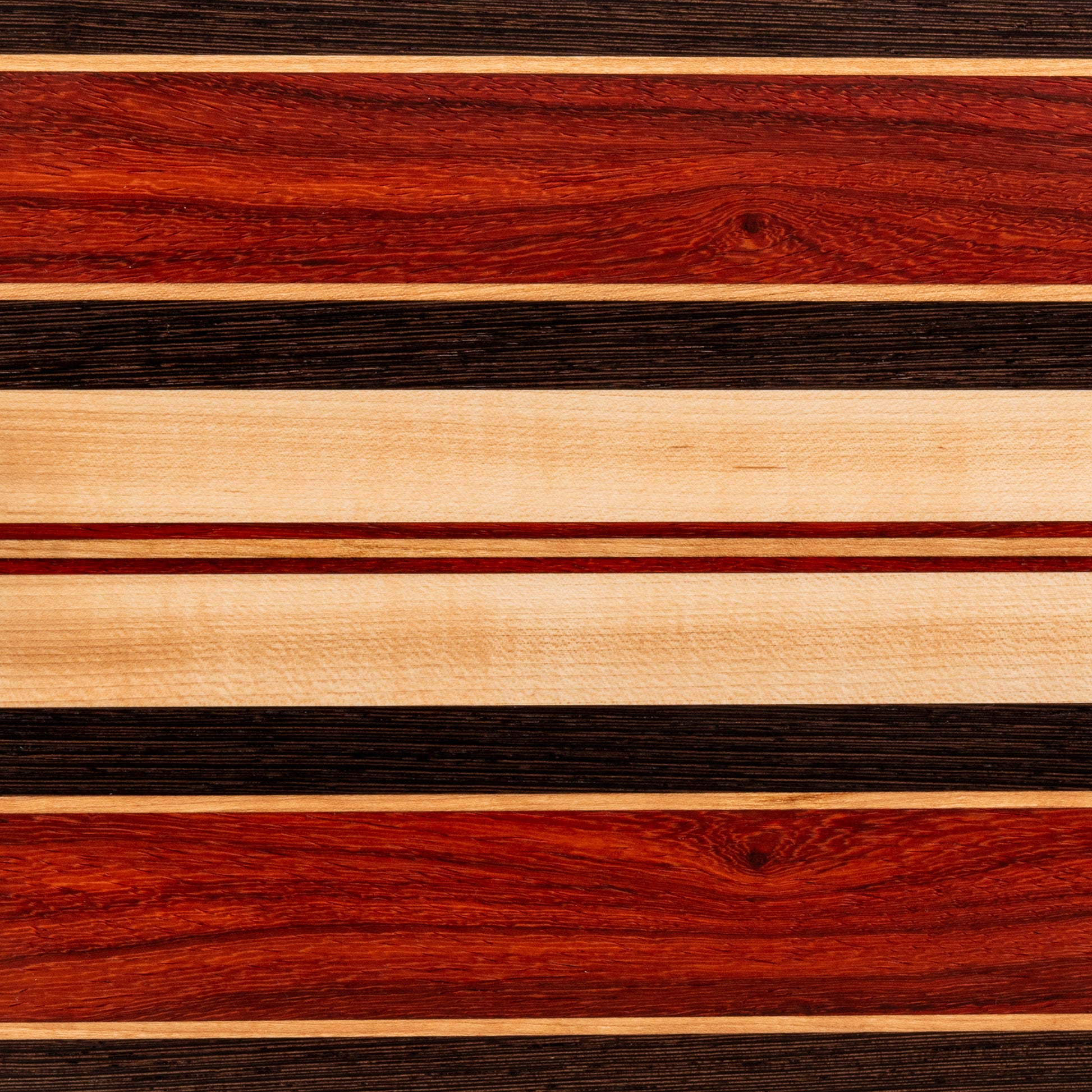 Edge Grain Cutting Board crafted from premium Wenge, Maple and Padouk. This beautiful piece measures approximately 40cmx28cmx2.5cm in dimensions (3,5cm with brass feet) . The finishing touch includes a mineral oil and beeswax treatment, ensuring both beauty and durability.