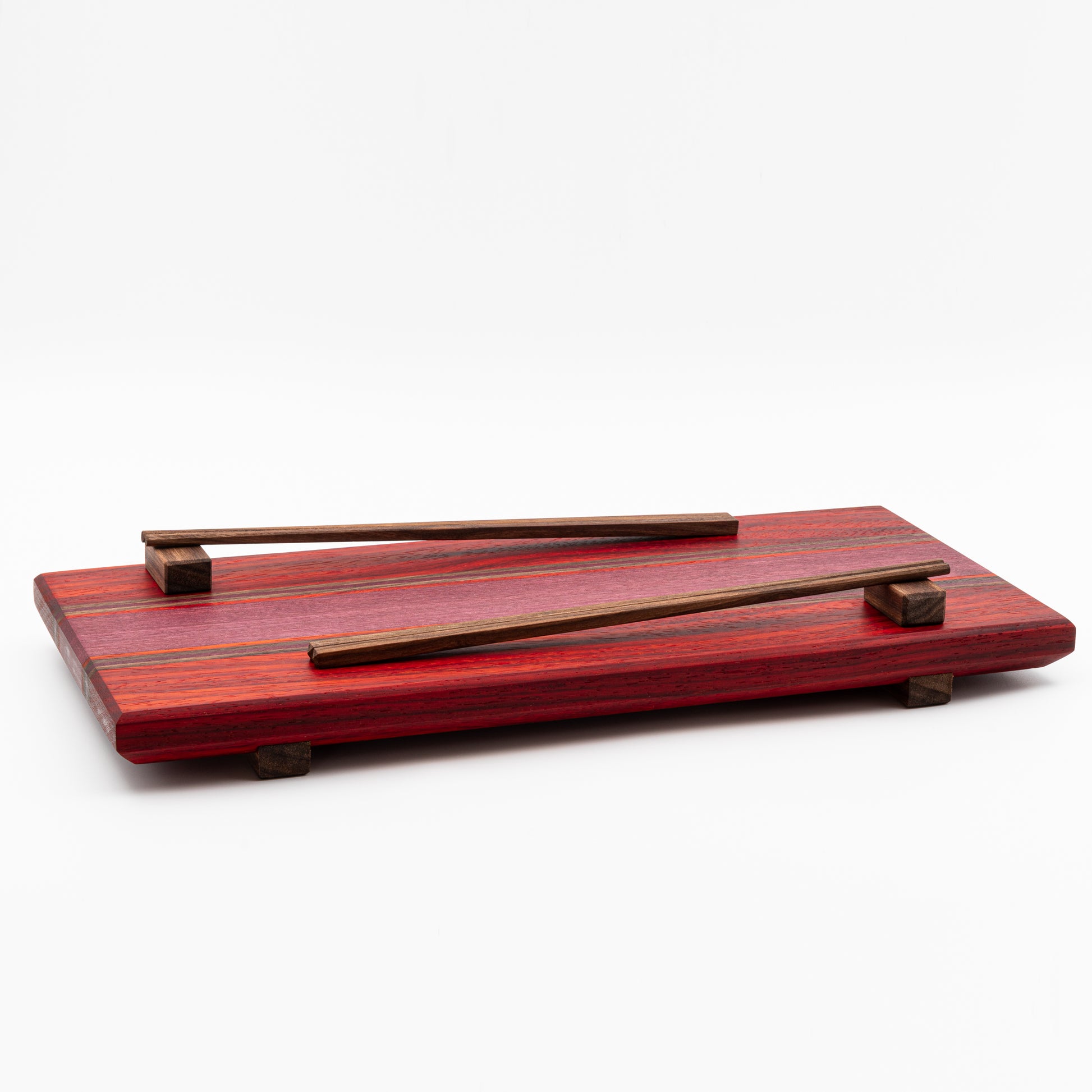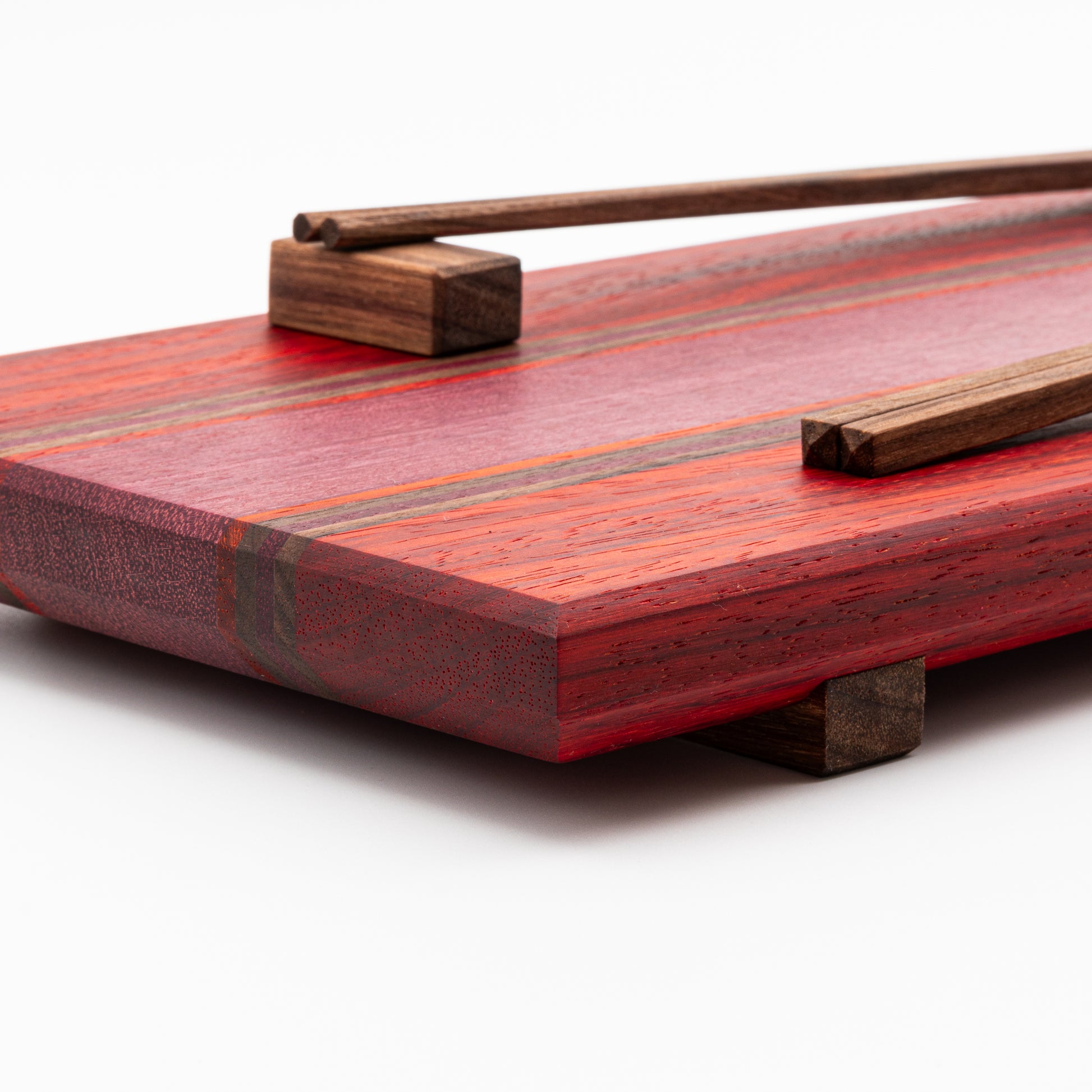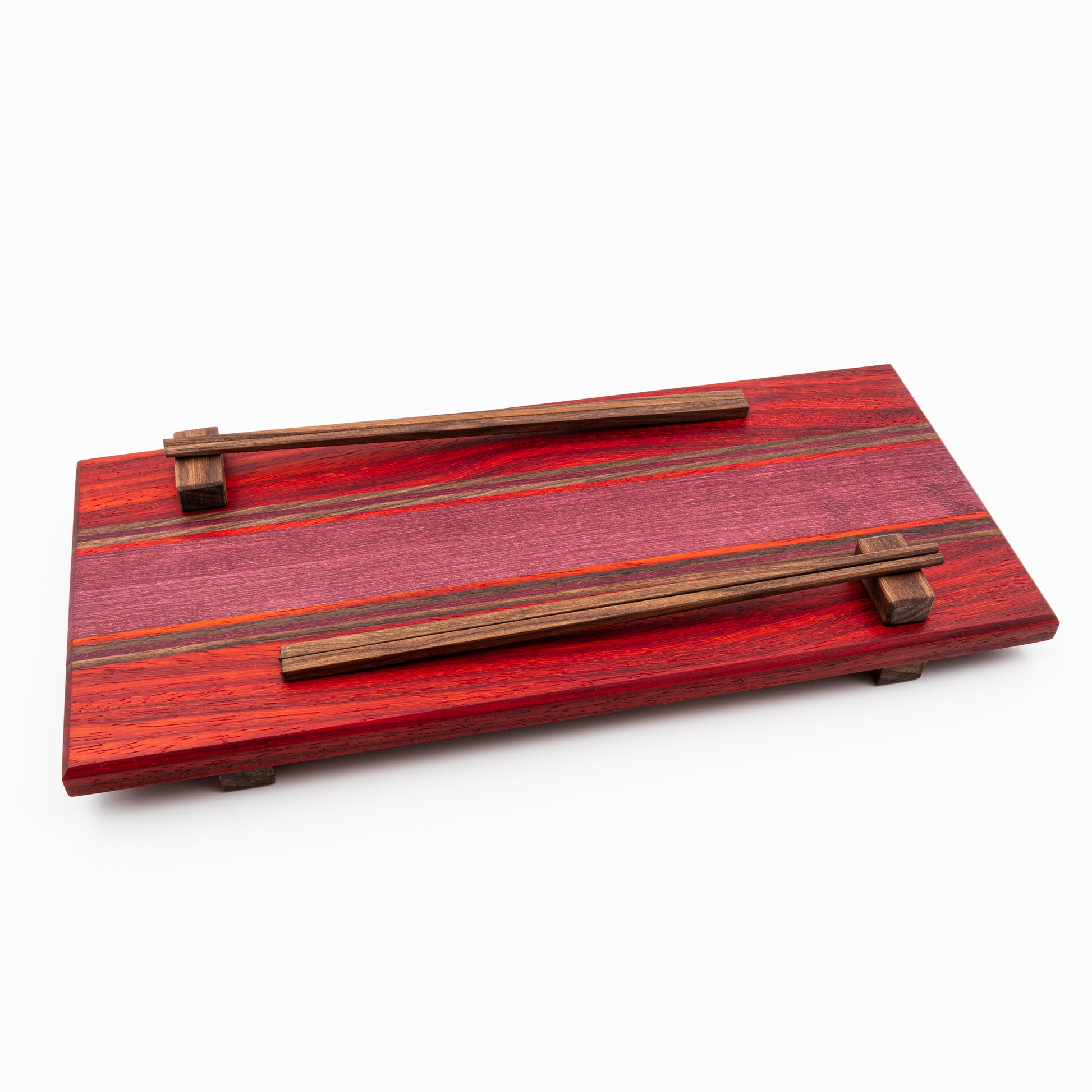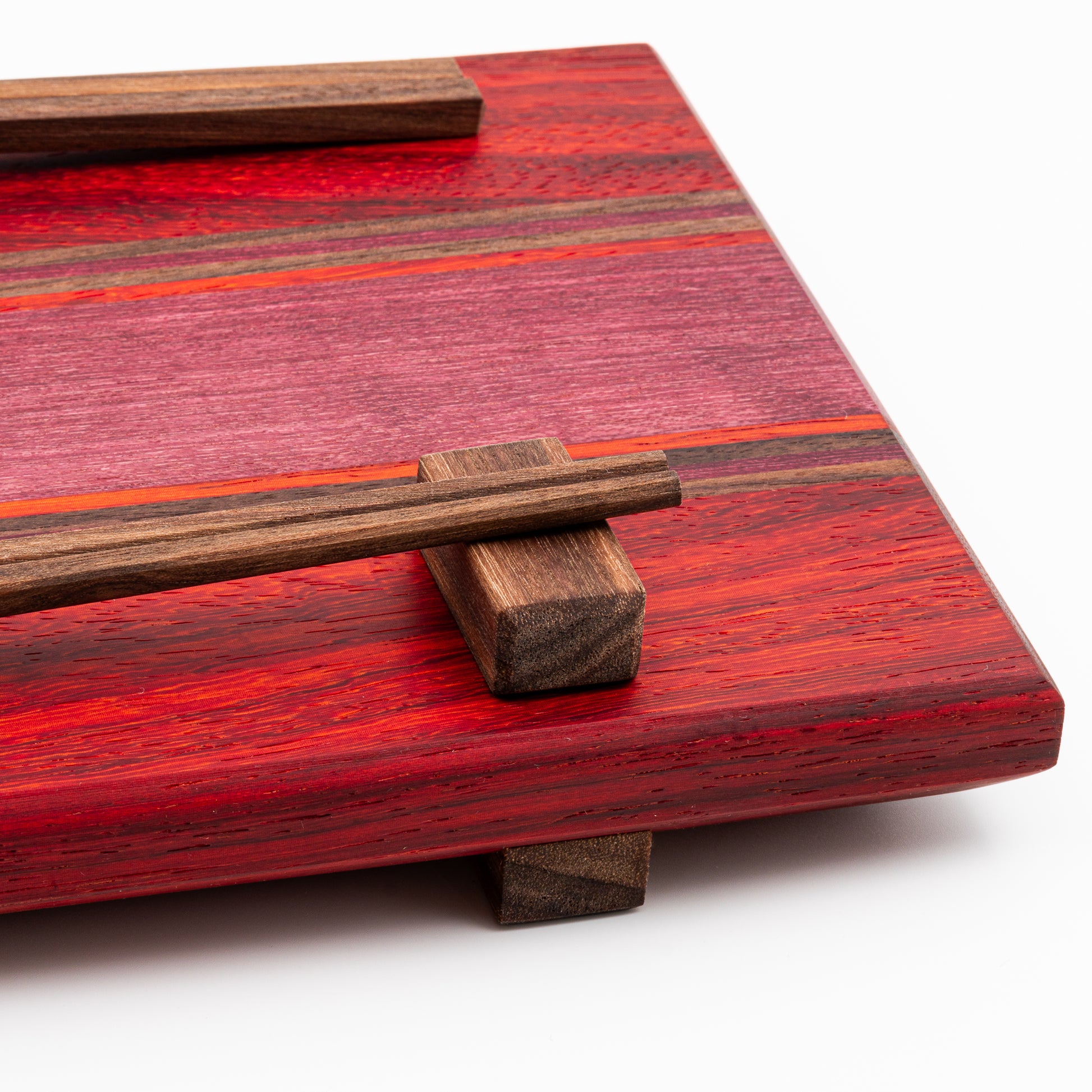 Introducing my japanese style sushi serving board crafted from premium Padouk, Purpleheart and American walnut. Dimensions: 40x17x3.5cm. Complete with two sets of chopsticks. It's the perfect centerpiece for your sushi nights. 🍣✨ #sushiboard #handcrafted #sushilovers